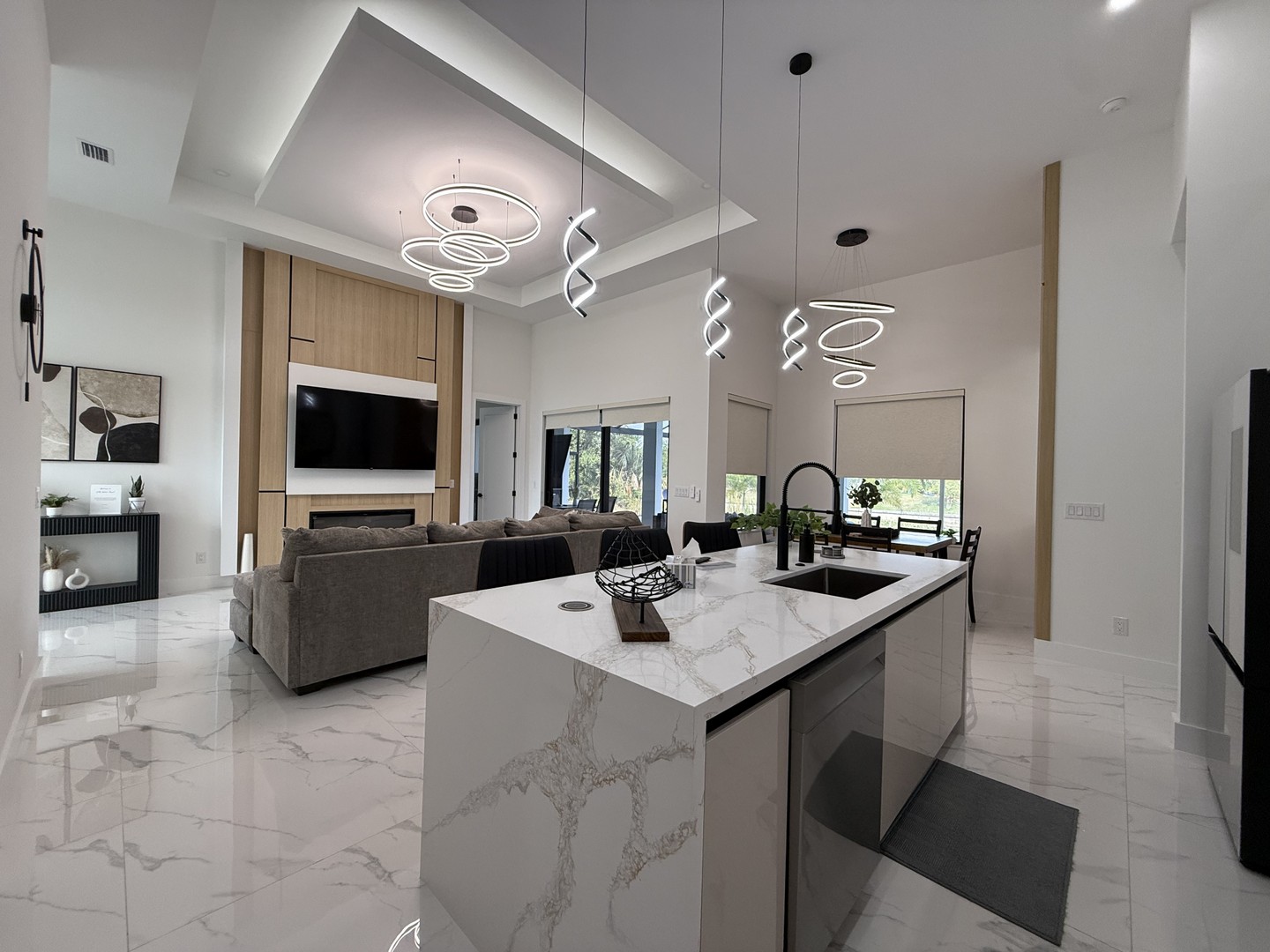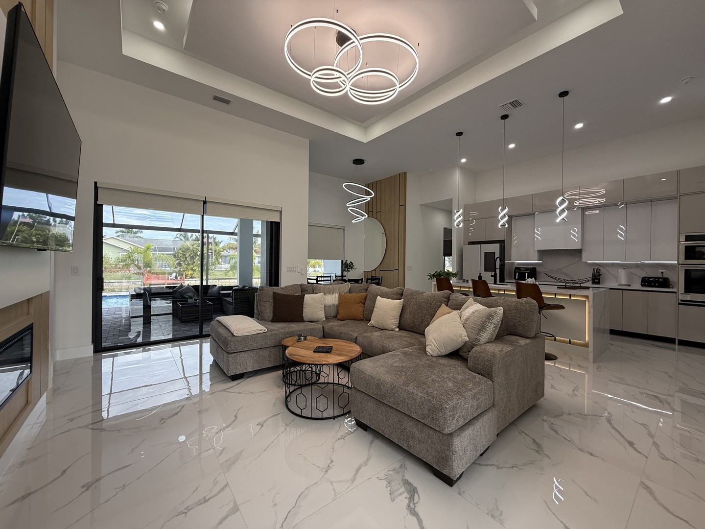 Der Wohnbereich wird durch einen schicken Eingangsbereich, eine kuschelige Couch in U-Form und eine toll gestaltete Wohnwand mit Kamin und 75 Zoll Fernseher geprägt.