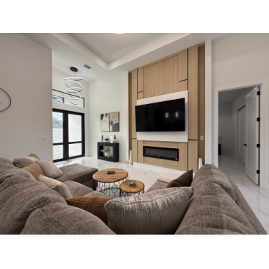 designed wall unit with a fireplace and 75-inch TV.