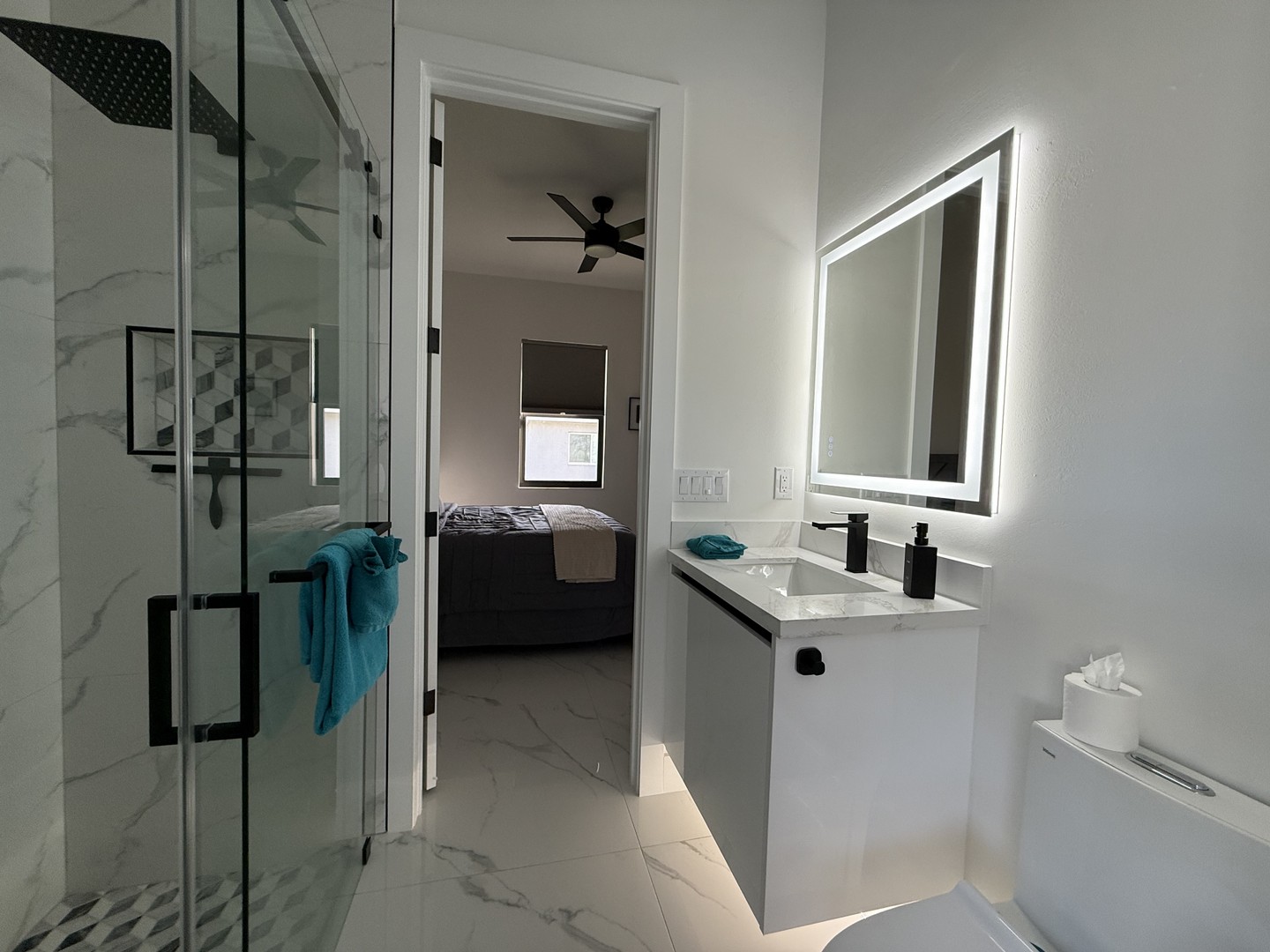and a 65-inch TV, features an en-suite bathroom with a