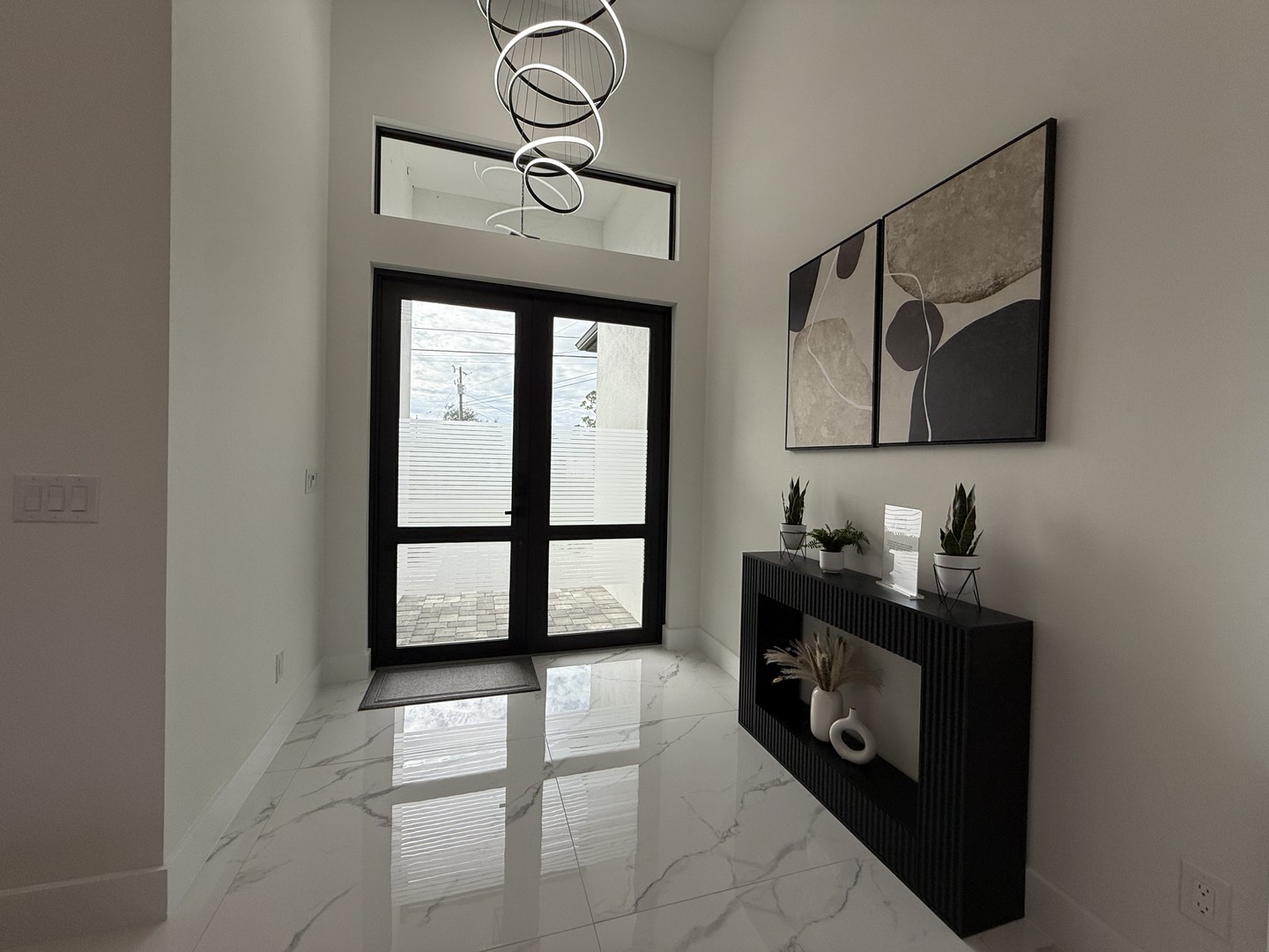 chic entryway, a cozy U-shaped couch, and a beautifully