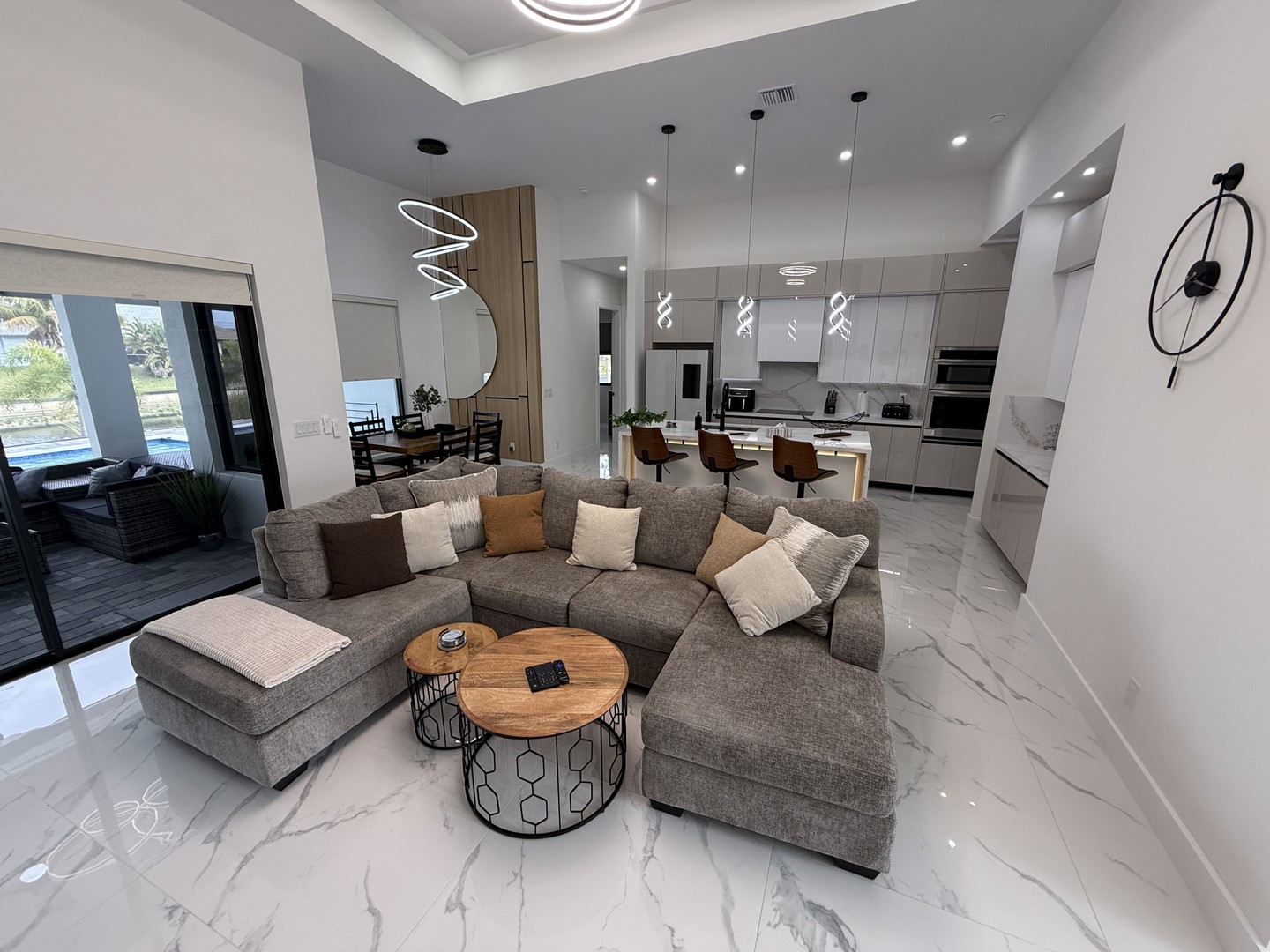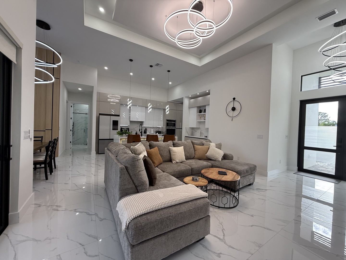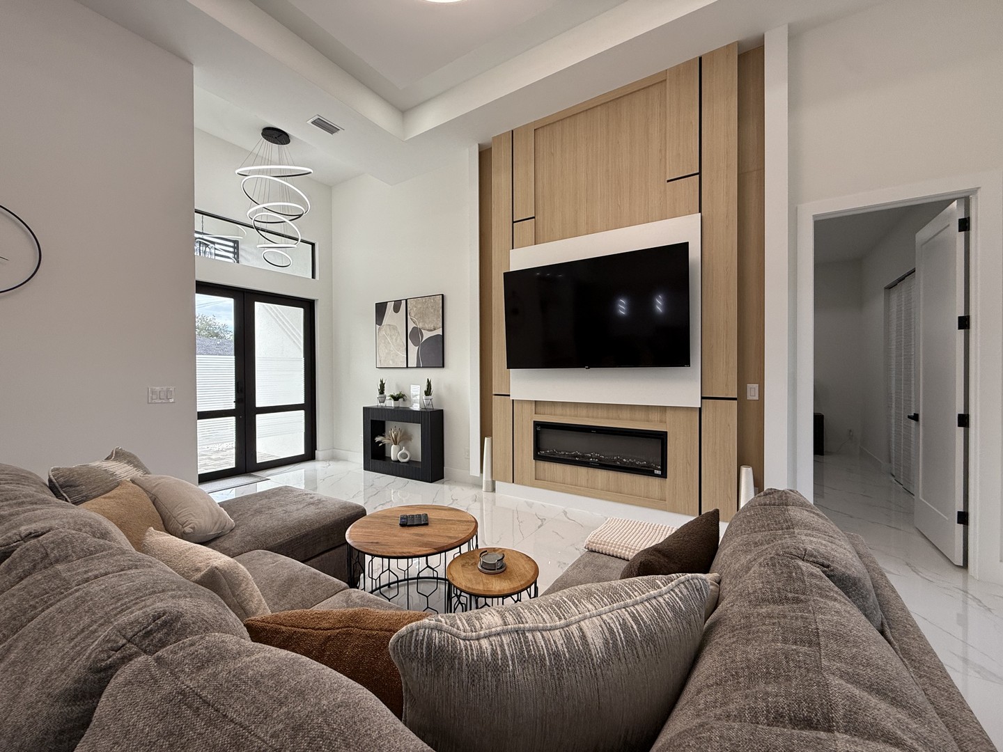 Der Wohnbereich wird durch einen schicken Eingangsbereich, eine kuschelige Couch in U-Form und eine toll gestaltete Wohnwand mit Kamin und 75 Zoll Fernseher geprägt.