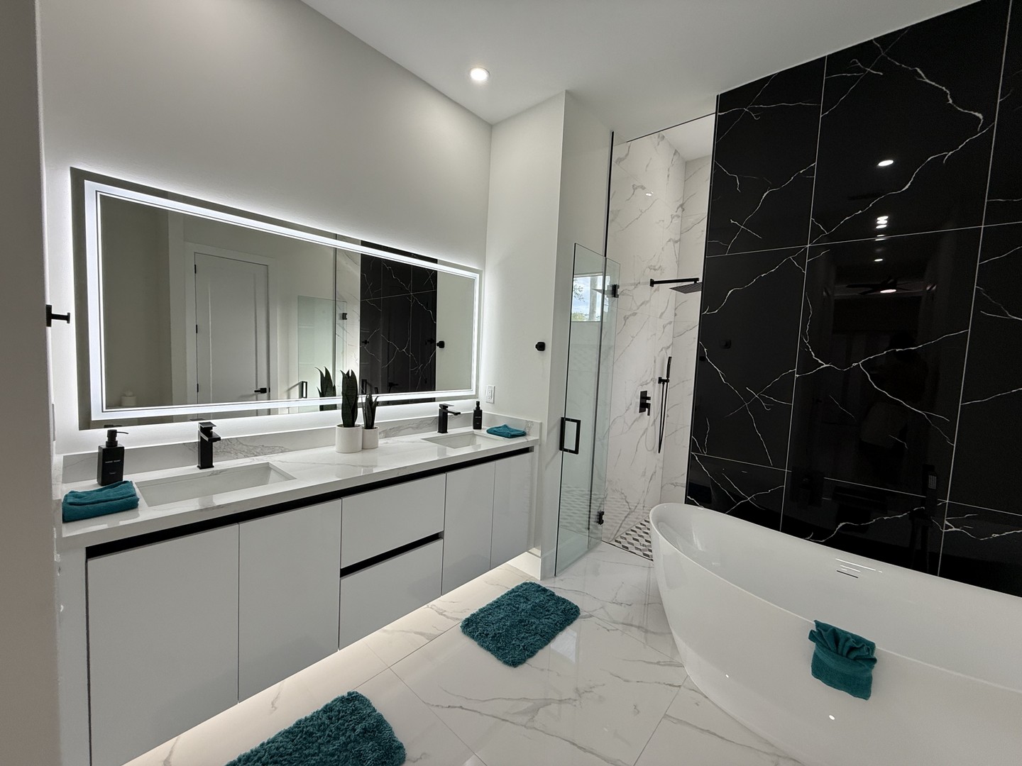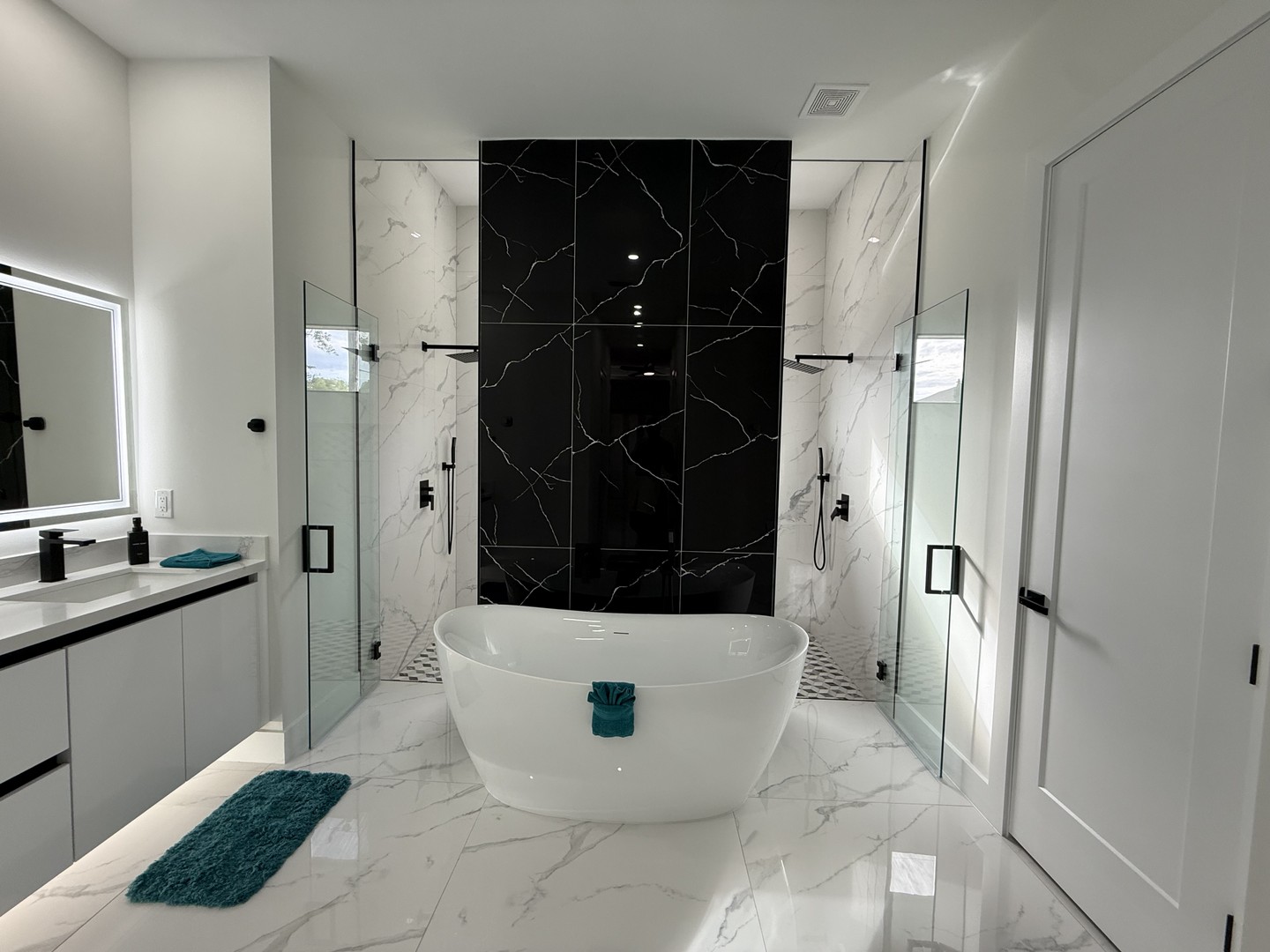 walk-in double shower, a freestanding bathtub, and a