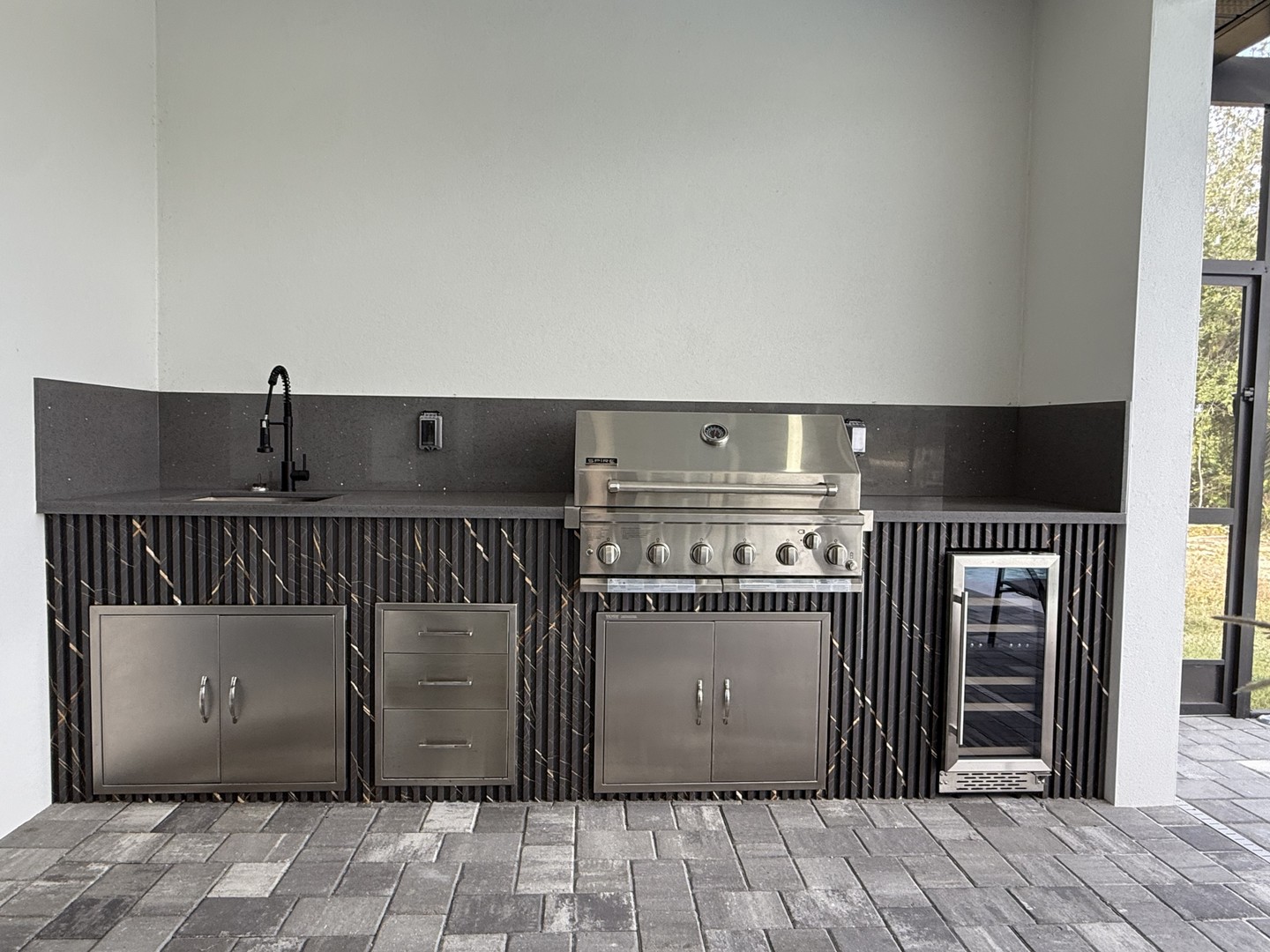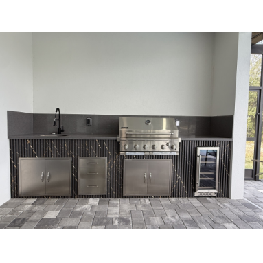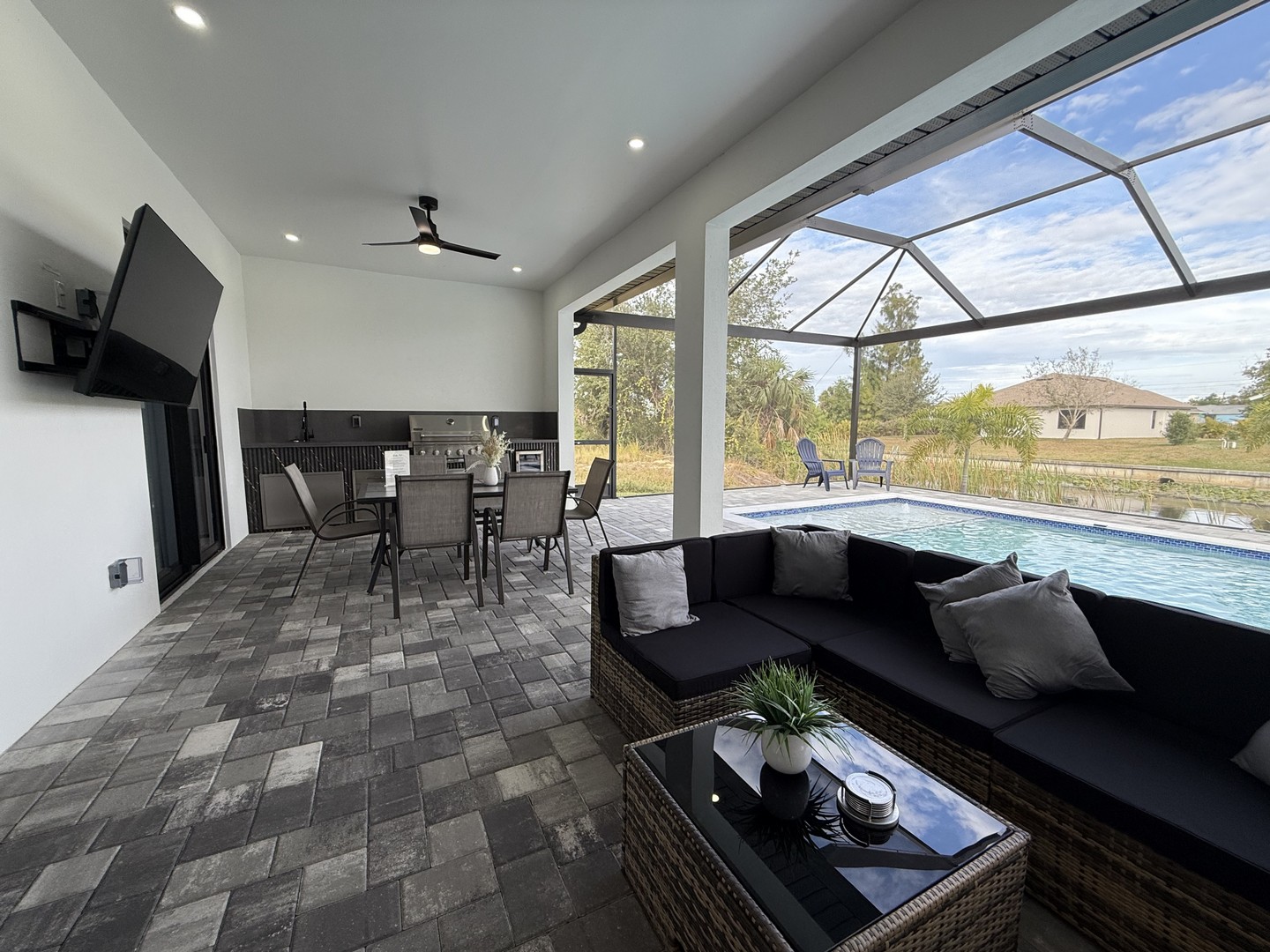 Patio: Covered and Screened Patio with Dining Table and seating for up to 6 people, Outdoor Kitchen with BBQ, Outdoor 65"TV, Lounge area, Deck Chairs, and Sun lounger